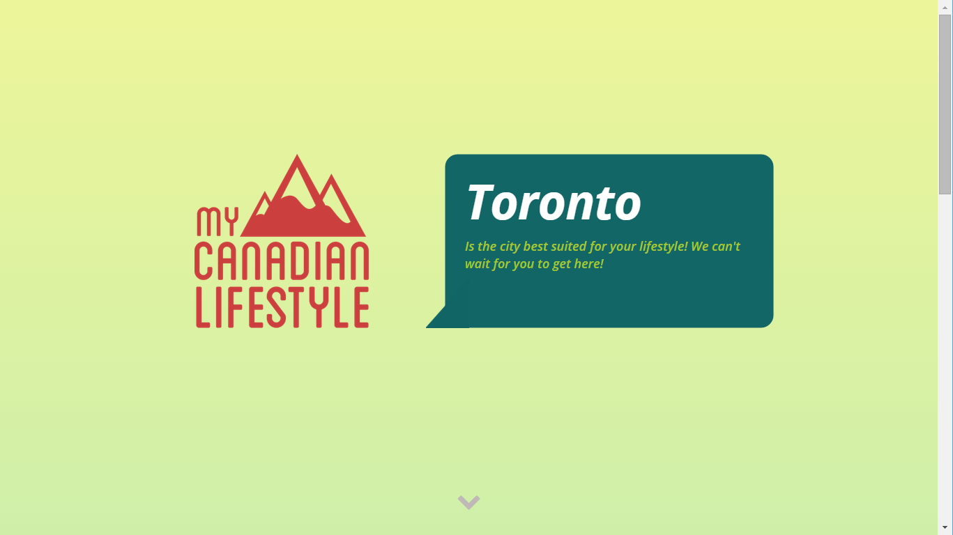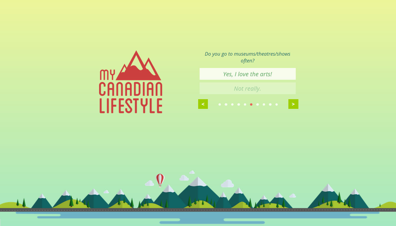 My Canadian Lifestyle provides users with a personalized answer about which Canadian city best suites their lifestyle, in order to provide the user with a rounded quality of life. The app takes the user's preferences and utilizes open data in order to generate a best result for each individual. We believe that a healthy lifestyle is attained both mentally and physically. Therefore, your surrounding environment plays a crucial role in determining your quality of life.