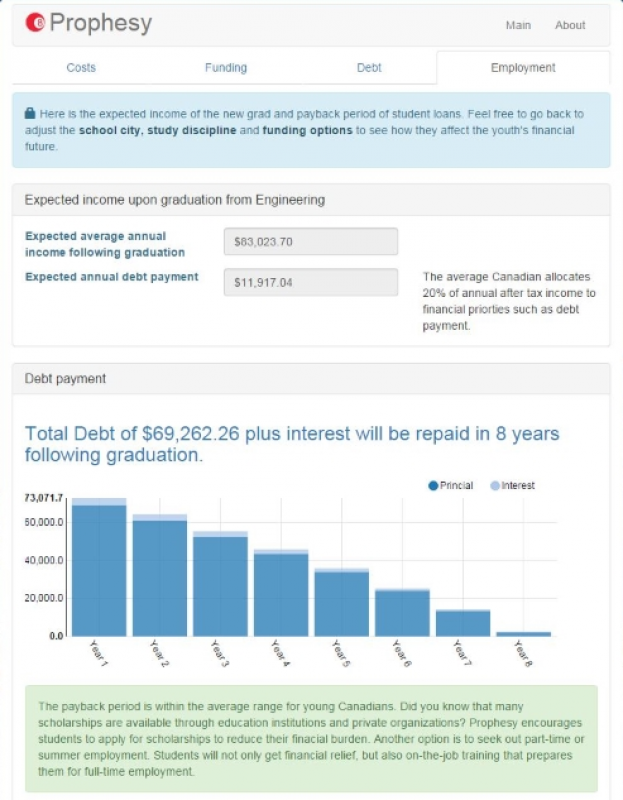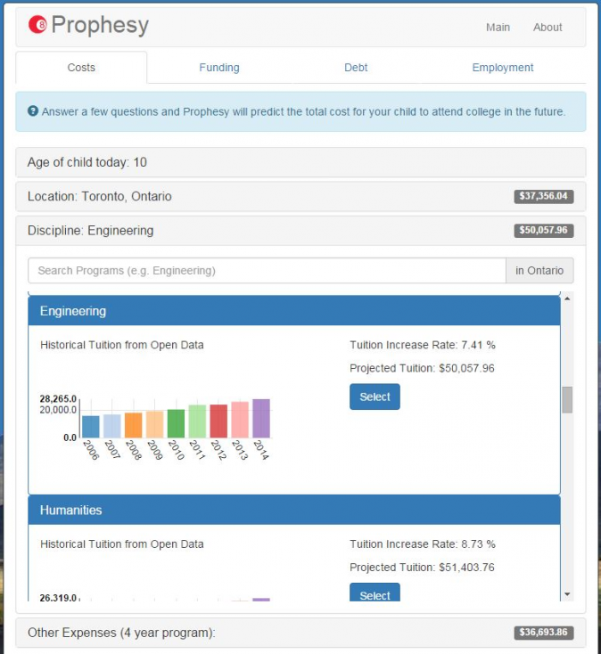 University graduates experience the highest employment growth of any educational attainment group over the last decade. However, the high cost of university education puts most students in significant debt. Prophesy uses Open Data to predict and assess young Canadians' financial health in the early stages of their careers. This allows young Canadians and their parents to gain insights into their future and plan ahead. We estimate cost of going to university by analyzing historical trends on rent, tuition and consumer price index across over 160 cities in the country. We also make personalized recommendations around loans and predict early career income based on field of study. Prophesy compares results to national averages and delivers the appropriate recommendations.